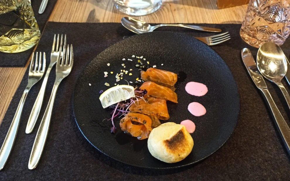 Večer nás čekalo pětichodové menu doplněné o salátový bufet. Každý pokoj měl po celý pobyt přidělený vlastní stůl, což přidávalo na pohodlí i soukromí. Večeře byly krásně servírované a založené na regionálních surovinách, které byly většinou sezónní a vždy čerstvé. V nabídce nechyběla zvěřina, pstruh z místní řeky, jehněčí či typické Schlipfkrapfen (domácí plněné těstoviny). Vegetariáni si také přišli na své, protože každý večer byla k dispozici alespoň jedna bezmasá varianta. Na závěr jsme si dopřávali tradiční rakouské dezerty, například plněné koblihy Krapfen. Během večeří jsme využili možnost vinného párování, které gastronomický zážitek pozvedlo na ještě vyšší úroveň. Z hotelového jídla jsme byli nadšení. Skvěle chutnalo, krásně vypadalo a bylo znát, že je připravované s láskou.