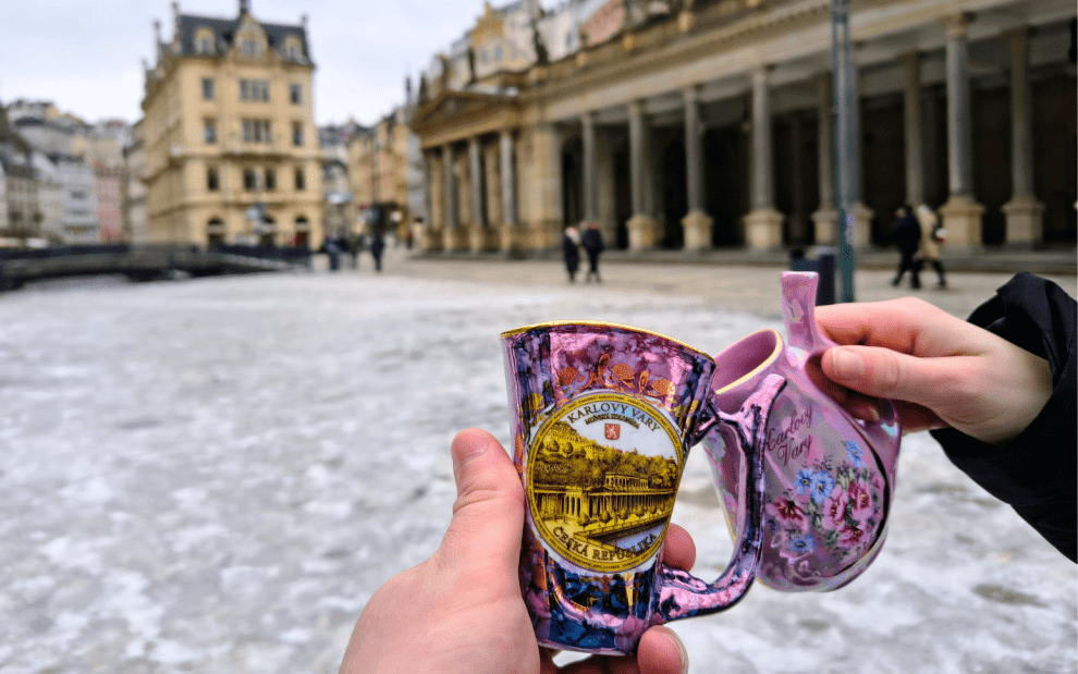 Pitná kúra a procházka po kolonádách: Dříve se lidé v karlovarských pramenech jen koupali, až později přišli na blahodárné účinky pitné kúry. Koupili jsme si proto lázeňská pítka a ochutnali většinu z 12 pramenů. Byla to příjemná procházka se zábavou navíc.