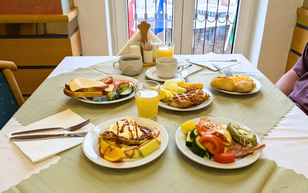 Po probuzení nás čekala bufetová snídaně plná dobrot, která se podávala od 7:30 do 10:00. Z restaurace byl krásný výhled na město, a tak nás trochu mrzelo, že není léto a my nemůžeme posnídat na terase. Pohled z oken na mrazivou krajinu nám ale snídani i tak zpříjemnil.