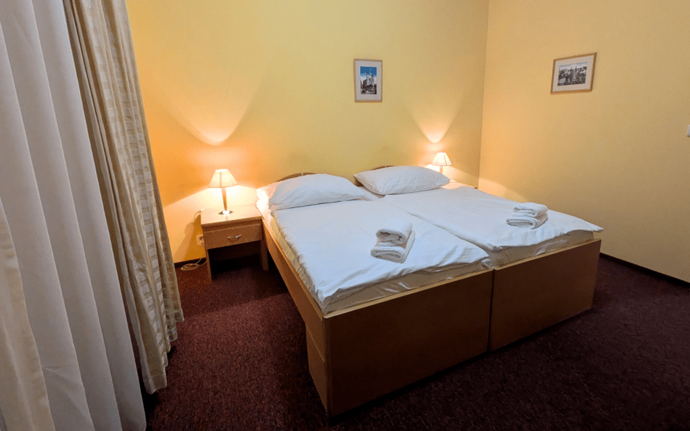 Ubytovali jsme se v dvoulůžkovém pokoji Superior v 1. patře. Hned po vstupu do pokoje nás nadchnul výhled z balkonu a francouzských oken. Po probuzení i před usnutím jsme se tak kochali nepřekonatelnými pohledy na Vřídlo, kostel Maří Magdalény, Hotel Pupp, Zámeckou věž i rozhledny a vyhlídky v okolí.