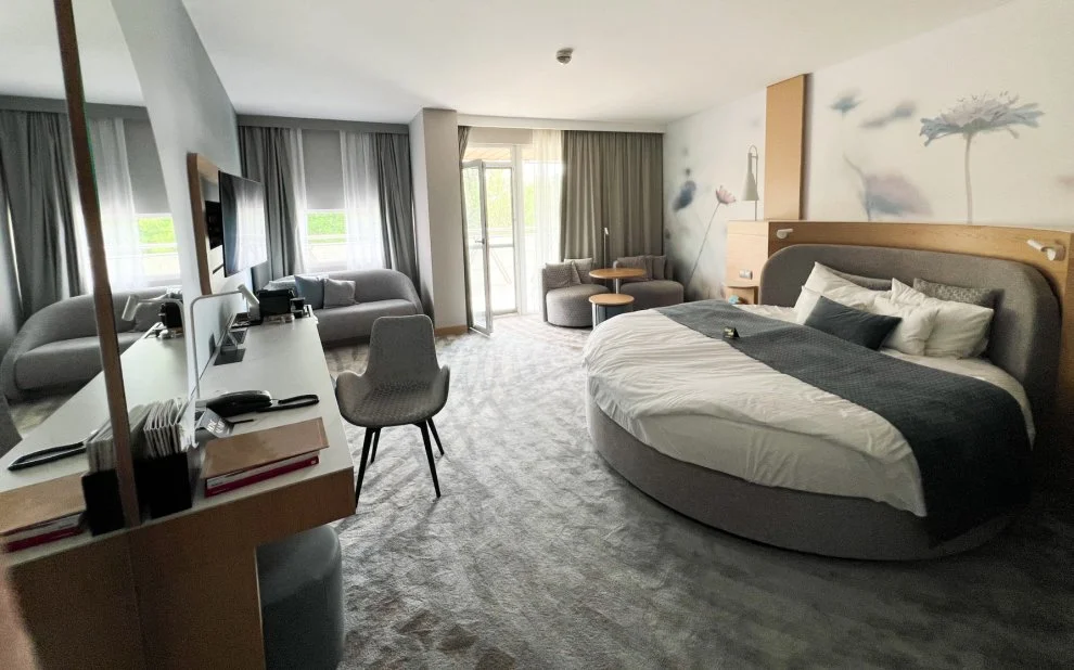 Ve druhém patře hotelu na nás čekal dvoulůžkový pokoj Premium s balkonem, který splňoval přesně to, co si člověk představí pod pojmem pětihvězdičkový komfort. Místnost působila moderně a vkusně – kombinace světlých barev, dřevěných prvků a decentních dekorací vytvářela příjemně klidnou atmosféru. Dominantou byla velká kruhová manželská postel typu Queen Size, která se po dni plném relaxace ve wellness stala naším oblíbeným místem pro večerní odpočinek. Dále byl pokoj zařízen psacím stolem, pohodlným posezením s křesly, Smart TV, minibarem a trezorem. V prostorné koupelně jsme ocenili prémiovou kosmetiku, jež dodala každému sprchování nádech luxusu. K dispozici byly i župany a pantofle, které jsme využili v hotelovém wellness. Z balkonu jsme měli krásný výhled na park a jezírka Csónakázó, jejichž hladina se za klidných večerů třpytila ve světle zapadajícího slunce. V takových chvílích jsme se naprosto odpojili od každodenních starostí a povinností, což bylo osvěžující. Vše bylo promyšlené do posledního detailu, a pokoj tak dokonale zapadal do celkové filozofie hotelu zaměřeného na relaxaci a pohodu.