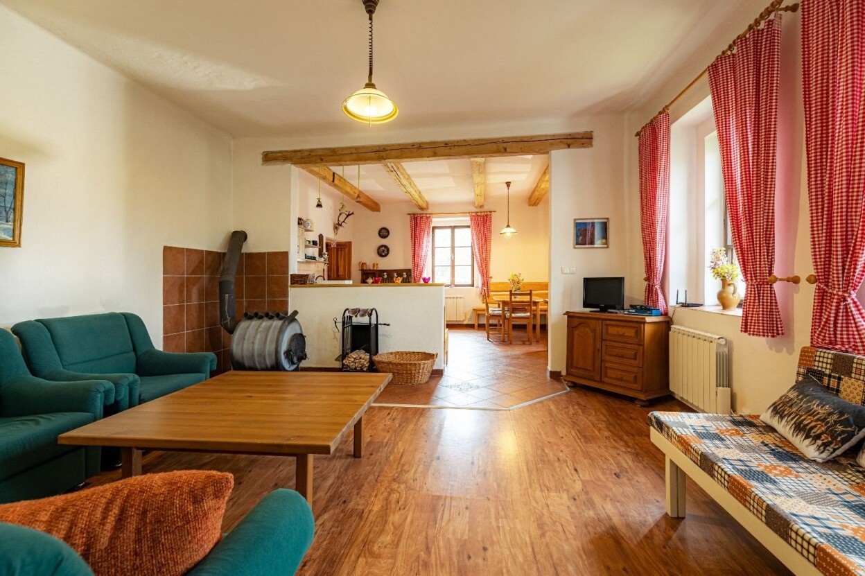 Velká společenská místnost s krbovými kamny, jídelním koutem a pohodlným posezením