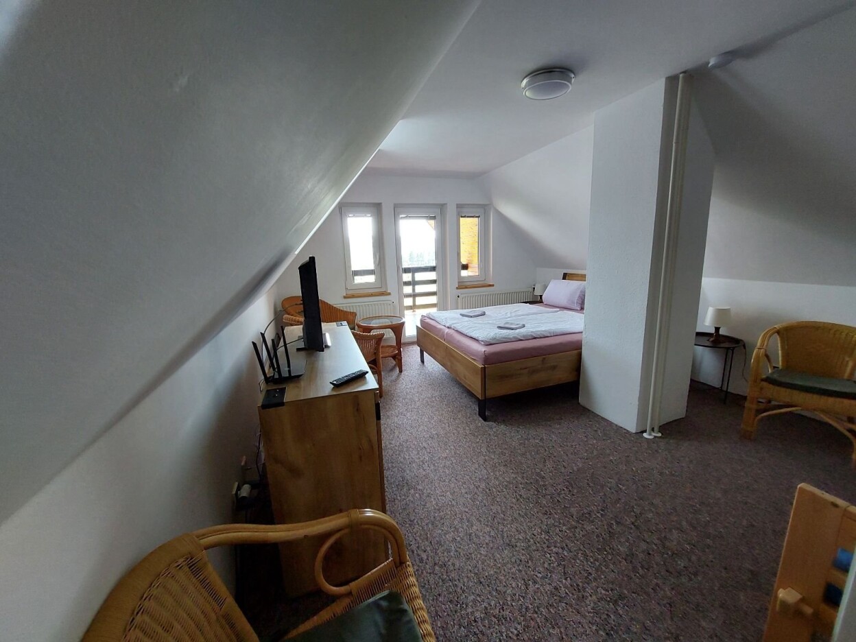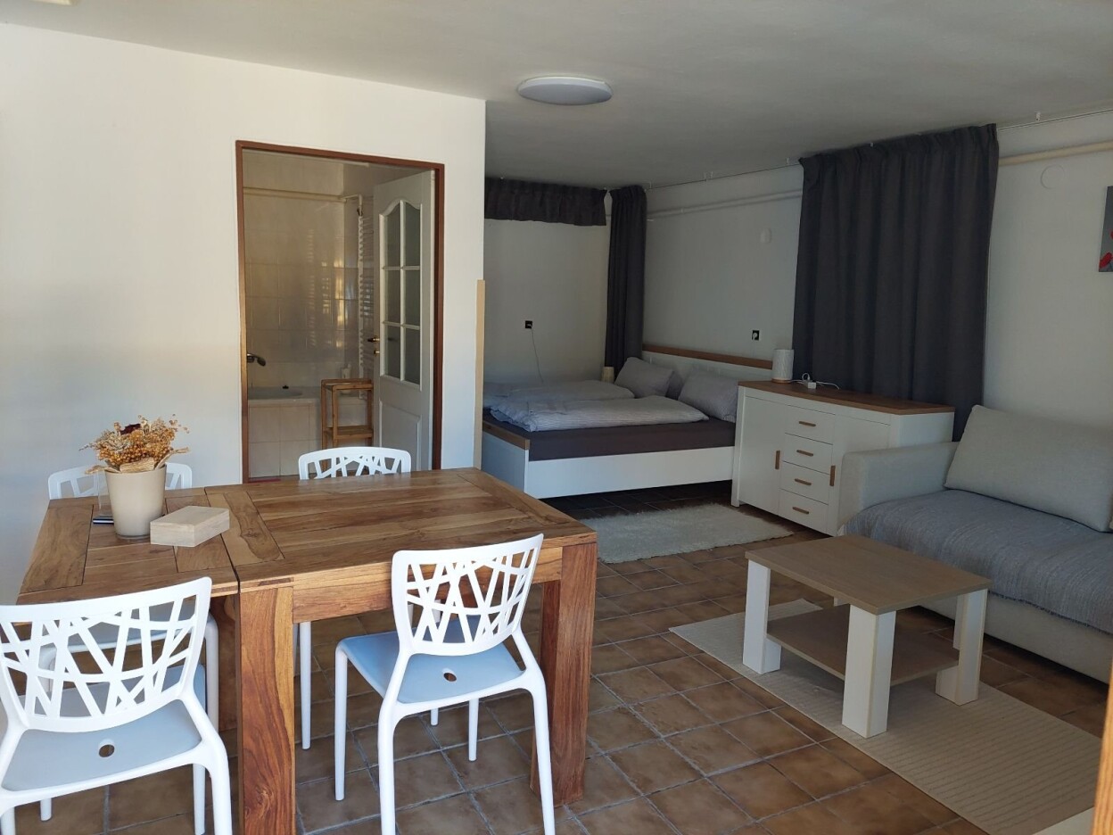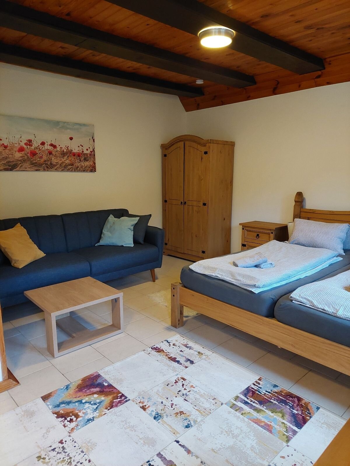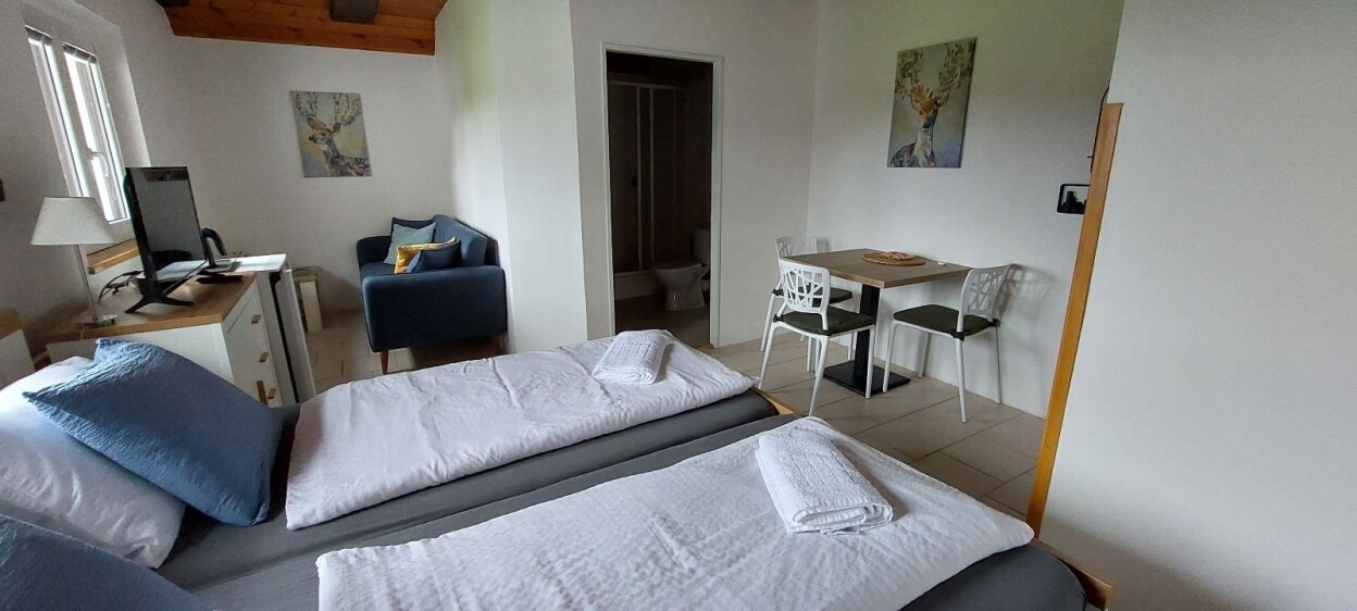 1.Pokoj 2+1 (dvoulůžkový pokoj s rozkládací pohovkou), koupelna se sprch. koutem a WC, stůl, lednice, koutek na přípravu kávy/čaje