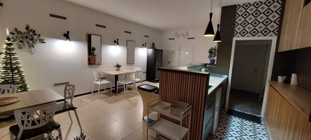 4.Apartmán 2+3 s bezbariérovým přístupem (situován v přízemí; s pevným a rozkládacím dvoulůžkem), jídelní kout, samostatná obytná kuchyně s rozkládací pohovkou, koupelna s vanou a WC.