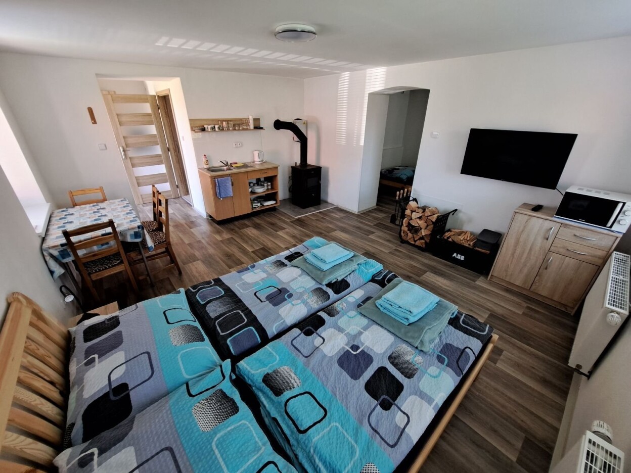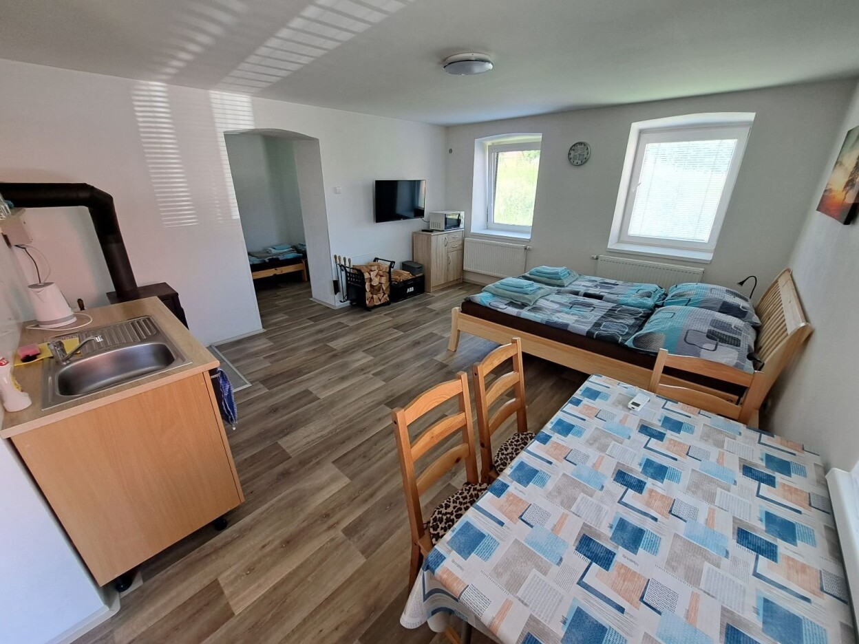 Celoročně Vám nabízíme útulné ubytování ve stylovém apartmánu, s celkovou kapacitou pro 4 hosty. Apartmán je součástí tradiční české usedlosti, která prošla pěknou renovací. Příjemné společné chvíle u nás strávíte v prostorné místnosti rozdělené na obývací, kuchyňskou a lůžkovou část. Z pohodlné manželské postele můžete rovnou sledovat televizi s kabelovým příjmem. O romantickou atmosféru se Vám postará hřejivý oheň z krbové pícky.