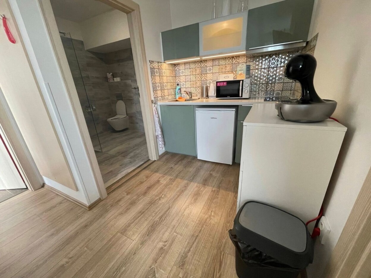 | Kuchyňský kout | mikrovlnná trouba, lednice, indukční vařič dvou plotýnkový, nádobí, příbory, inventář, jar, houbička,utěrka |